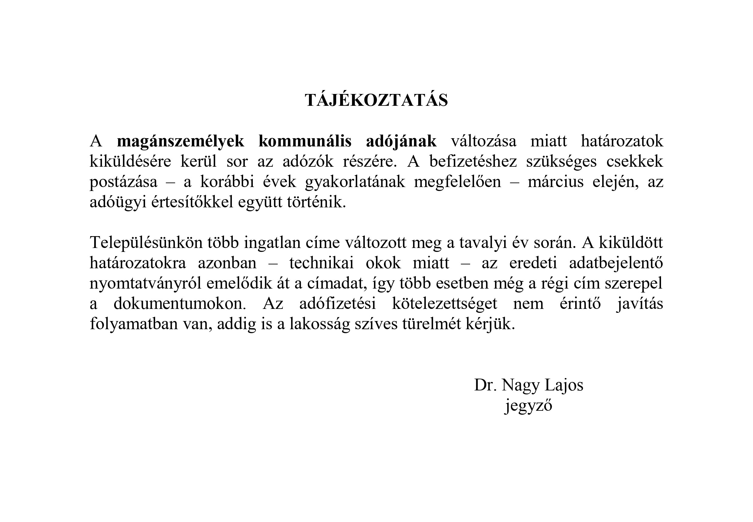 Tájékoztatás magánszemélyek kommunális adójának változásáról (címek javítása)